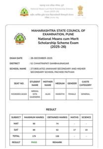 लिंबगाव तालुका पैठण येथील कुमारी गीता निर्मळ हिने दिनांक 28 डिसेंबर 2025 मध्येNMMS(राष्ट्रीय आर्थिक दुर्बल घटक विद्यार्थ्यांसाठी शिष्यवृत्ती योजना परीक्षा(2025-26) दिली होती तिचा निकाल दिनांक 25 फेब्रुवारी रोजी जाहीर झाला या परीक्षेमध्ये कुमारी गीता गजेंद्र निर्मळ हिने 179पैकी136 गुण मिळवून पैठण तालुक्यातून प्रथम क्रमांक मिळवला ती संजीवनी कोचिंग क्लासेस ची विद्यार्थीनींआहे लिंबगाव सारख्या छोट्याशा खेडेगावातून येऊन तिने पैठण तालुक्यातून प्रथम क्रमांक पटकावला तिला हे यश कठोर परिश्रम सातत्याने योग्य मार्गदर्शन यामुळेच मिळालं आहे या यशाचे श्रेय आई वडील तसेच गुरुजनवर्ग आणि मैत्रिणींना दिले आहे मला पुढे हइंजिनियर व्हायचं आहे असे तिने लोक महाराष्ट्र न्यूज च्या प्रतिनिधीशी बोलताना सांगितले या मिळालेल्या यशामुळे तिचं सर्वत्र कौतुक होत आहे आणि अभिनंदन करण्यात येत आहे