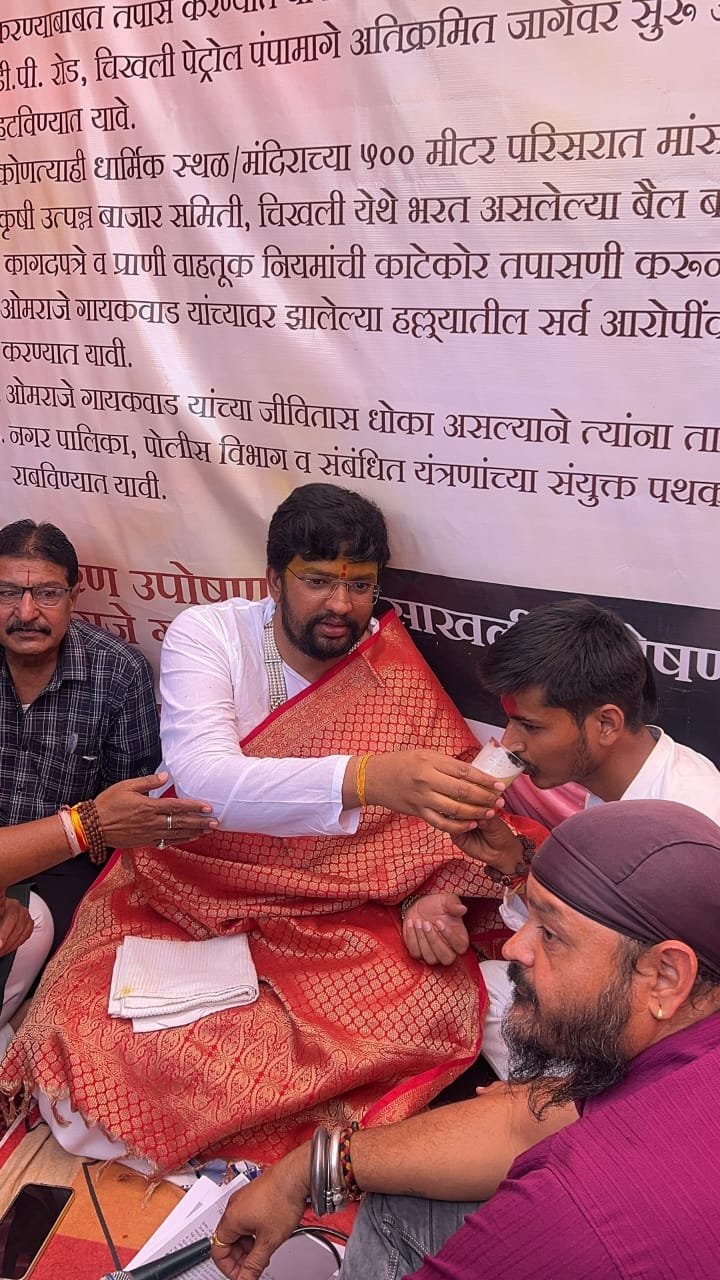 गौसेवा संरक्षणासाठी श्री ओम राजे गायकवाड व त्यांच्या सहकाऱ्यांकडून तहसील कार्यालयासमोर आमरण उपोषण सुरू होते. चिखली शहरात अवैध गौकत्तल थांबवावी, गौमांस विक्रीवर बंदी आणावी तसेच दोषींवर कठोर कारवाई करावी, या प्रमुख मागण्या आंदोलनकर्त्यांनी मांडल्या होत्या.