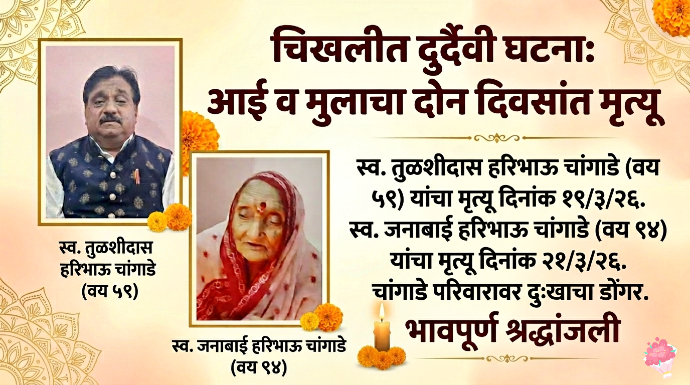 चिखली शहरातील चांगाडे परिवारावर अत्यंत दुर्दैवी प्रसंग ओढावला असून, अवघ्या दोन दिवसांच्या अंतरात आई आणि मुलाचा मृत्यू झाल्याने संपूर्ण परिसरात हळहळ व्यक्त केली जात आहे. या घटनेमुळे नागरिकांमध्ये शोककळा पसरली असून, अनेकांनी या कुटुंबाच्या दुःखात सहभागी होत संवेदना व्यक्त केल्या आहेत.