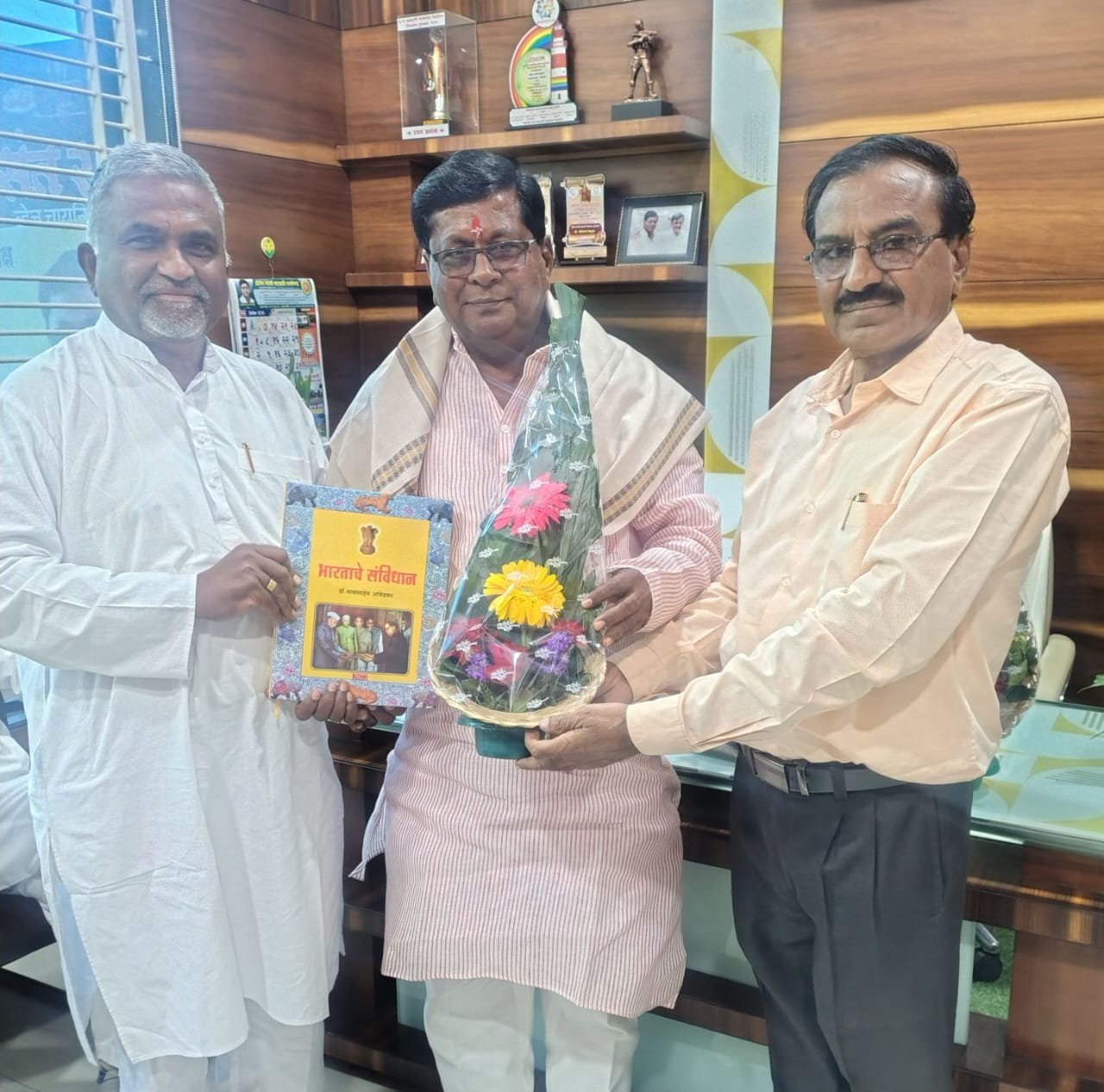 प्रविण डोंगरदिवे (चिखली) : नुकत्याच संपन्न झालेल्या चिखली नगर पालिकेच्या नगराध्यक्षपदी जनतेमधून विजयी झाल्याबद्दल भारतीय जनता पक्षाचे निष्ठावंत जेष्ठ नेते, श्रीराम नागरी सहकारी पत संस्थेचे संस्थापक अध्यक्ष, पंडितराव दादा देशमुख यांचा विश्वरत्न ,महामानव, भारतरत्न डॉ.बाबासाहेब आंबेडकर यांनी लिहिलेले “भारताचे संविधान” शाल, पुष्पगुच्छ देऊन सेवा निवृत्त प्राचार्य तथा डॉ.पंजाबराव देशमुख नागरी सहकारी पत संस्थेचे उपाध्यक्ष गणेशराव देशमुख तसेच सेवा निवृत्त शिक्षक तथा डॉ. पंजाबराव देशमुख नागरी सहकारी पत संस्थेचे तज्ञ संचालक,साहित्यिक किसन पिसे यांनी श्रीराम नागरी सहकारी पत संस्थेच्या कार्यालयात लोकनियुक्त नगराध्यक्ष पंडितराव देशमुख यांची सदिच्छा भेट घेऊन सत्कार केला. यावेळी श्रीराम नागरी सहकारी पत संस्थेचे संचालक रामेश्वर पवळ, शेतकरी संघटनेचे नेते समाधान कणखर व इतर मान्यवर मंडळी उपस्थित होते.